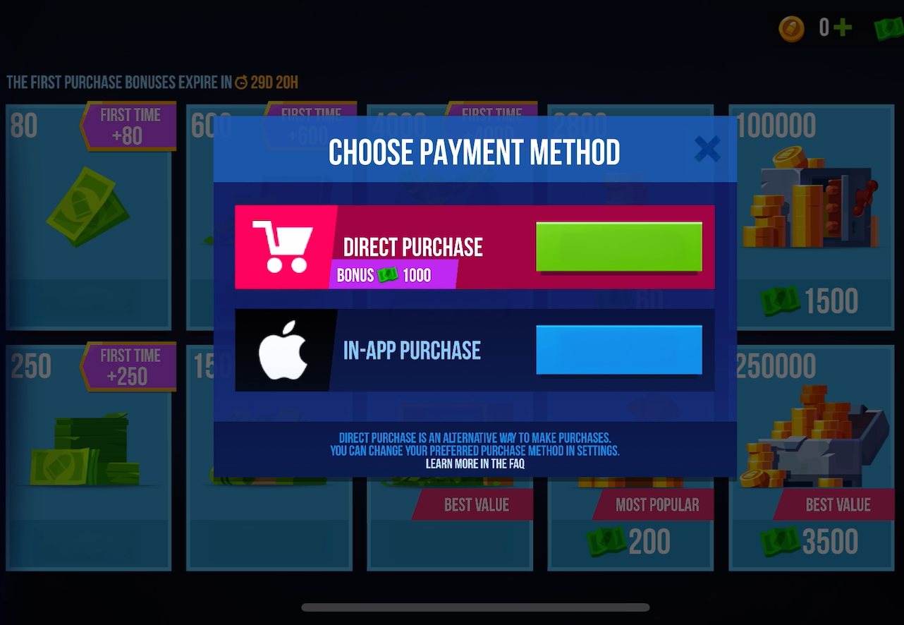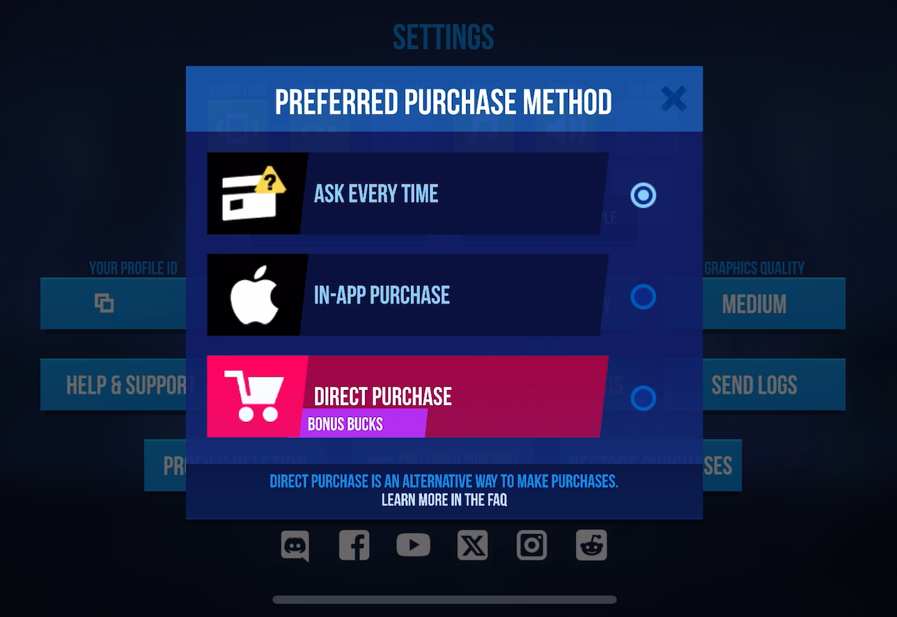 A new button has been added in the game settings to choose your preferred payment method — you can set a default or be prompted at each purchase.