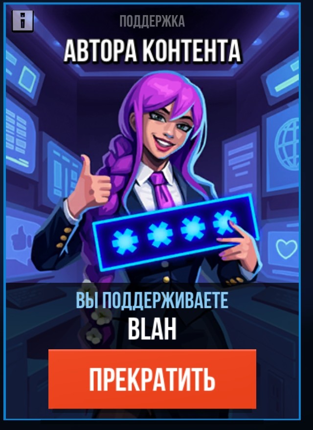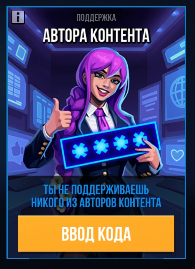 Поддержите вашего любимого автора контента — введите его код, и определённый процент от каждой вашей покупки за реальные деньги (кроме подписки) будет перенаправлен автору, чей код вы ввели!